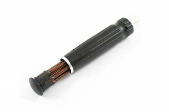 One handle, now seven wrenches! This space saving tool is ideal for those not wishing to cart the tool box around. The hollow aluminium handle houses 1.5mm, 2mm, 2.5mm and 3mm hex wrench bits, along with two Phillips sizes and a slotted bit. Simply select the one you want and slide into the handle end where a pre-installed magnet keeps the bit securely in place.