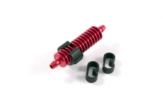 The Exhaust Gas Cooler is mounted between the tuned pipe and the fuel tank and so it will take away some heat from the exhaust gas that goes into the fueltank, lowering the temprature of the fuel and increasing the runtime. Available in a selection of colours and with additional mounting clip and fuel clips it is a must have addition for any serious racer.